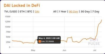 Далее рассмотрим хронологию перехода DeFi от зимнего хайпа к летнему. Хронология этого перехода представлена в виде серии слайд-шоу, отображающих динамику общей суммы заблокированных в DeFi средств, исчисляемых в USD, ETH и DAI (источник - сервис DefiPulse). DAI - это те самые фантики-"стейблкоины" DeFi-флагмана первой половины 2020 года MakerDAO, которые тот раздавал в обмен на "залог" криптовалюты, главным образом - на "залог" eth.