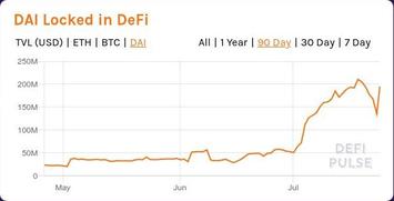 В целом принципиальная картина не изменилась: график ETH показывает всё тот же вялый интерес к DeFi; "капитализация" DeFi в долларах вплотную приблизилась к февральскому максимуму - благодаря вертолётным деньгам центро-банков на начало июня курс ETH/USD скорректировался на 80% относительно мартовского завала. Но вместе с тем на графике DAI хорошо заметен всплеск - будущий новый лидер DeFi-сектора, сервис Compaund, использует более широкий набор залоговых инструментов в сравнении с MakerDAO. И поначалу одним из основных залогововых инструментов Compaund-а помимо ETH был именно фантик DAI.